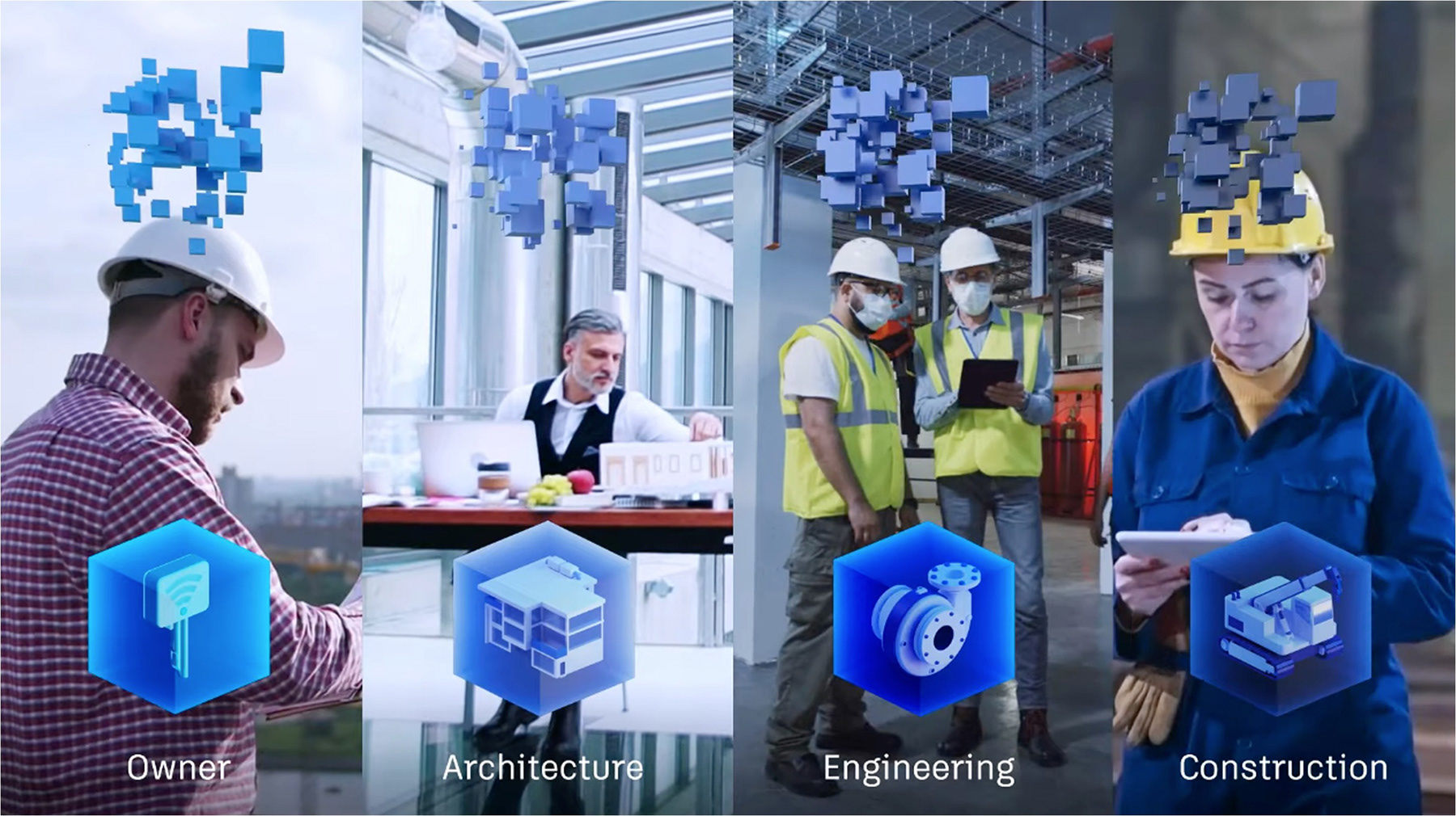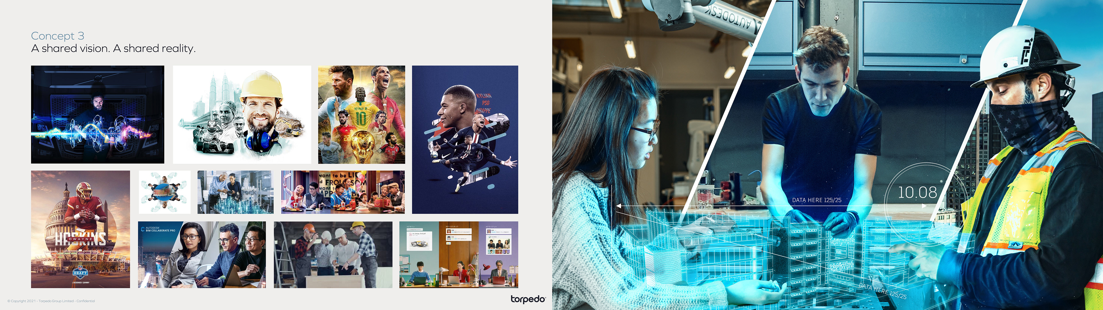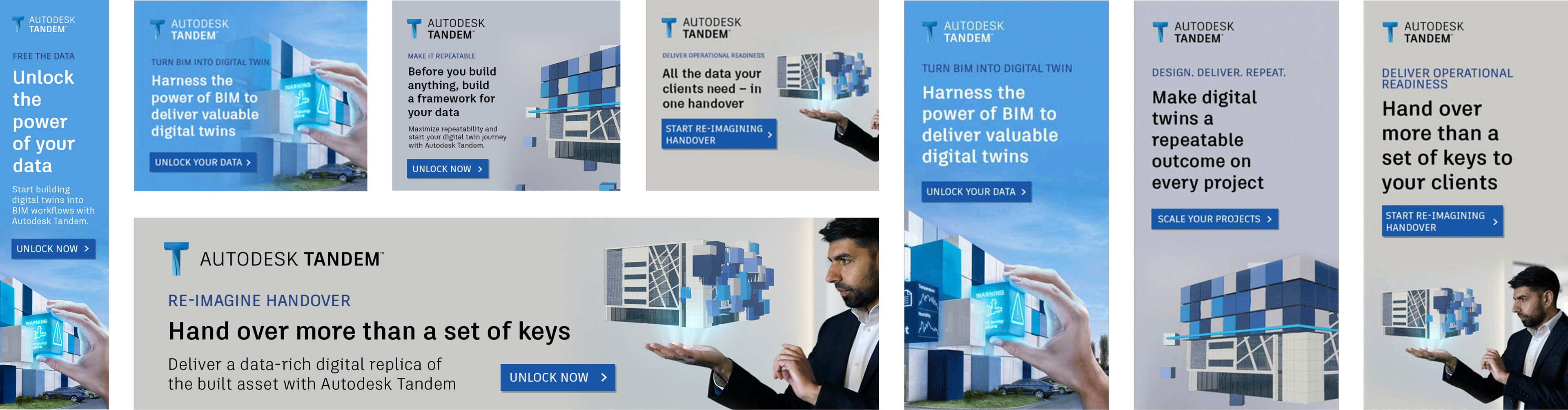 The creative was driven by research and user needs with a focus on data at the heart of the story. Instead of representing a digital twin as a virtual wireframe—like every other competitor—we used ‘data blocks’ to represent building information, workflows and 3D models. The ‘data blocks’ were designed to represent various types of information from different users and visualise how Autodesk Tandem puts customers in the driving seat of their own digital twin future and puts the control in their hands. 'Remotely access all project data, from anywhere in the world'.