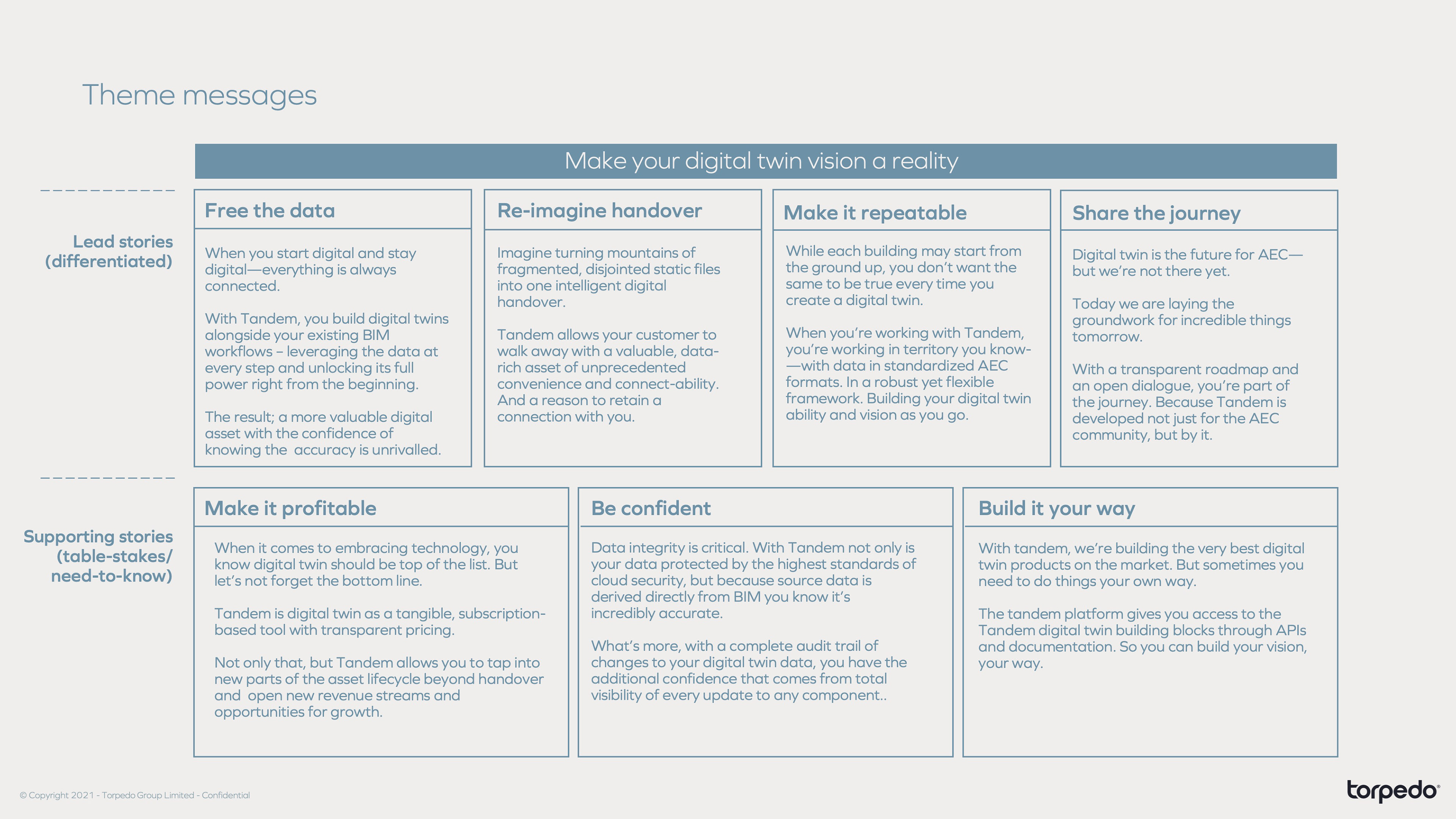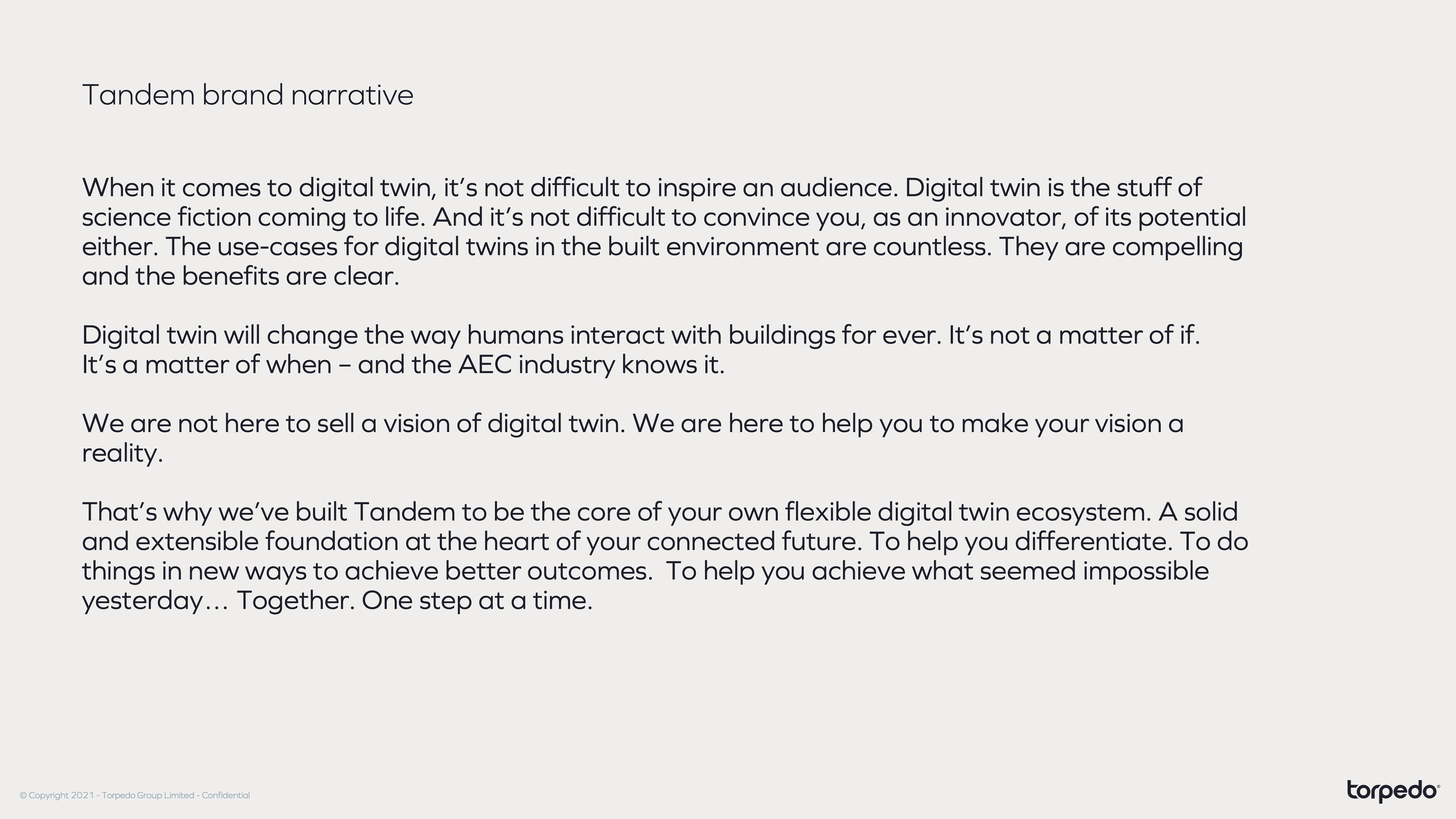 "Torpedo's work on Tandem was not just a display of creativity but also a testament to their deep understanding of a complex audience landscape. They crafted a user journey that speaks uniquely to the varying levels of understanding and maturity in the digital twin space. By intuitively navigating through the intricacies of each target audience, they created a flow that both engages and caters to their unique needs and knowledge base. This thoughtful approach has significantly enhanced the user experience, making it accessible to all."