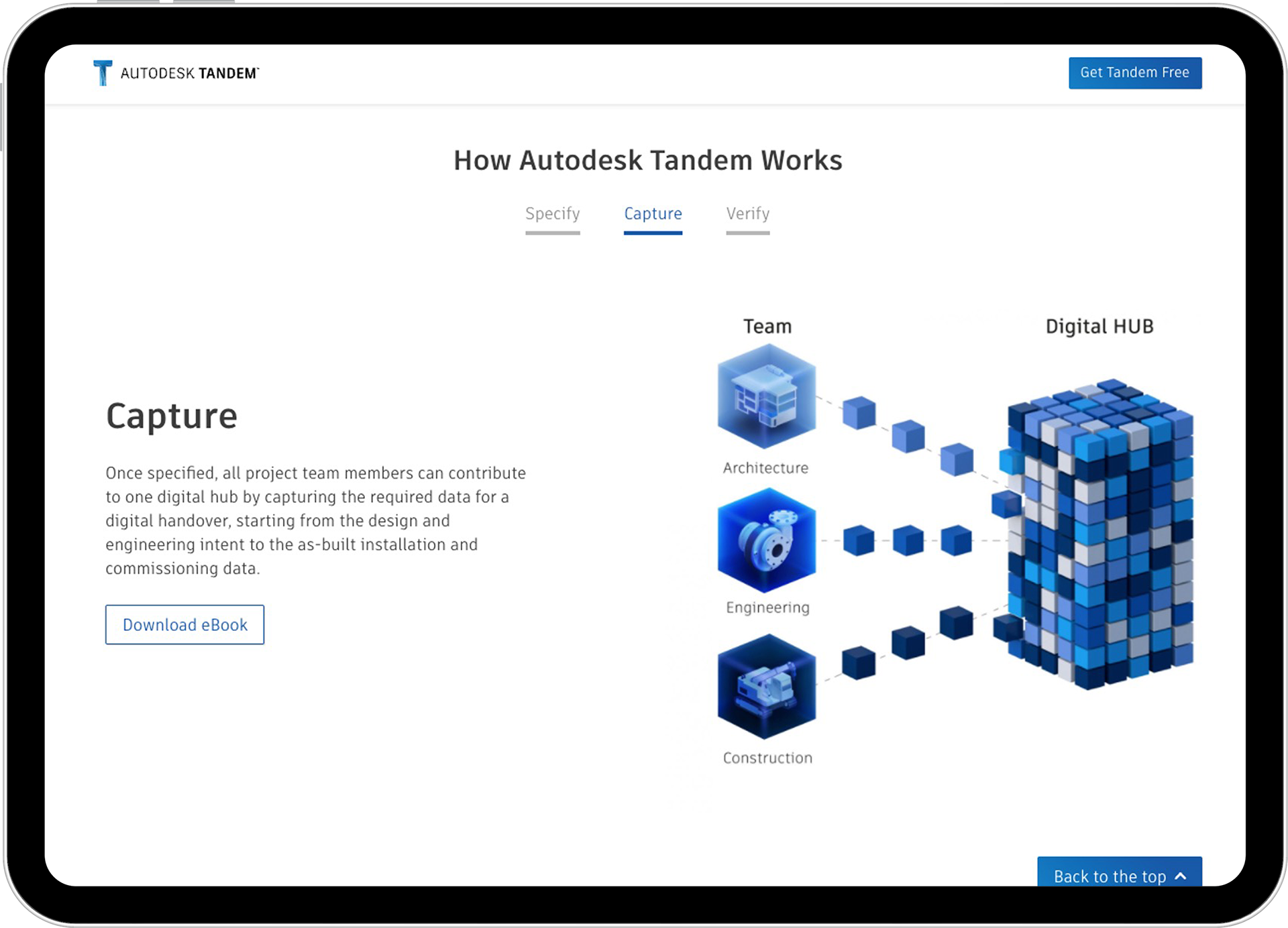 Autodesk Tandem is a cloud-based digital twin platform for AEC. A digital twin is a dynamic, live digital replica of a physical asset that combines design, construction and operational data to simulate, predict and inform decisions. Tandem helps make the building handover process seamless and enables proactive Owner maintenance, providing insight into operation, performance and efficiency.