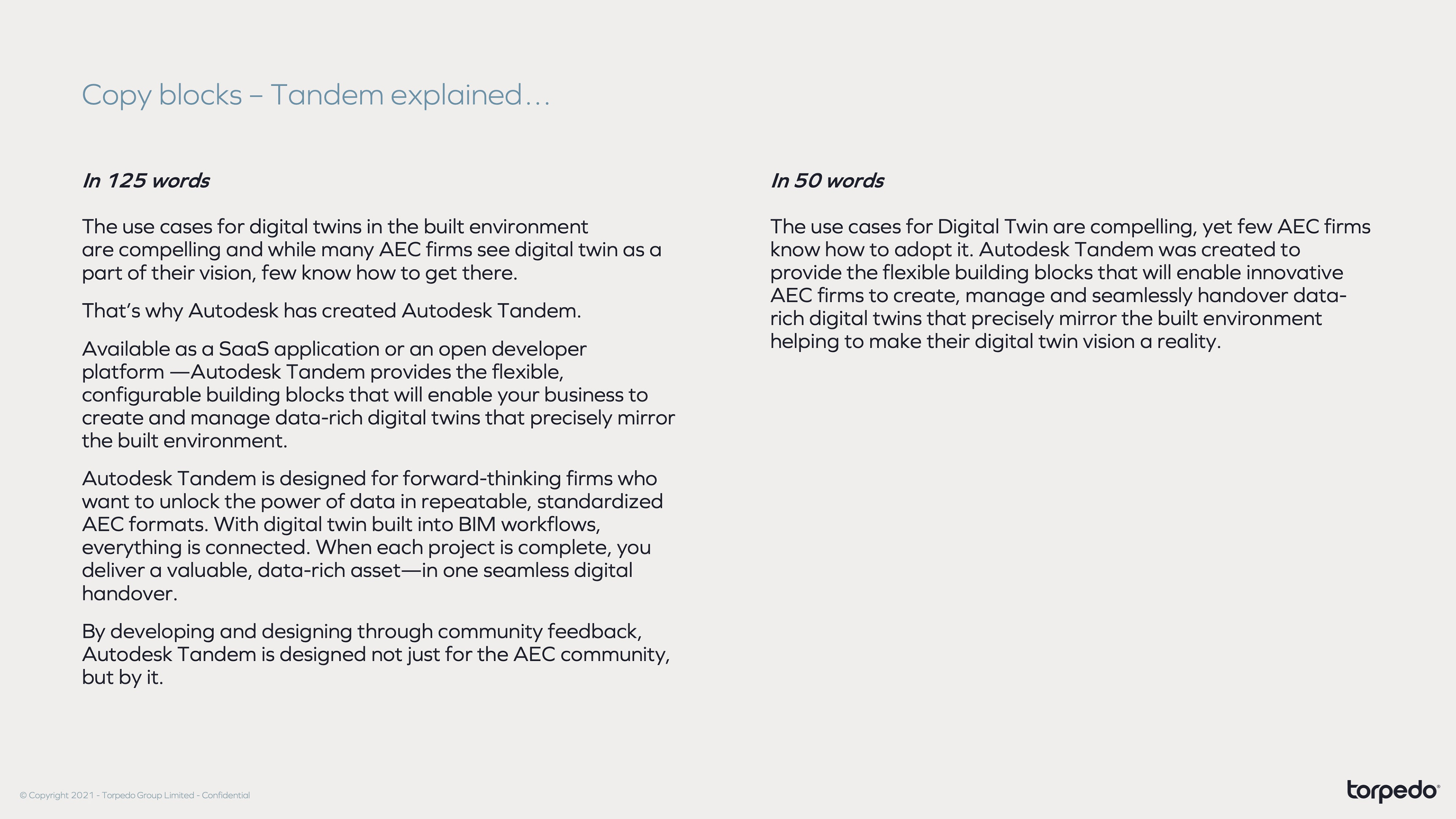 Develop a compelling brand narrative for Tandem that connects to the Autodesk master brand and expresses what digital twins in the AEC space mean to Autodesk and their customers.